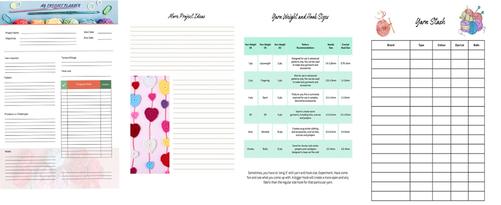 * Space for materials, hook sizes, pattern notes, and deadlines.